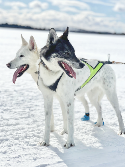 Our dogs are our family members and their wellbeing, happiness and safety is the most important thing to us. We want our dogs to feel most loved and comfortable in everything we do, whether it is on the training runs, exploring the wilderness, on the race trails, at work with tourists or at home. Our "working dogs" are all Alaskan huskies and then we have two Siberian huskies just as pets (a life choice that they have made themselves).